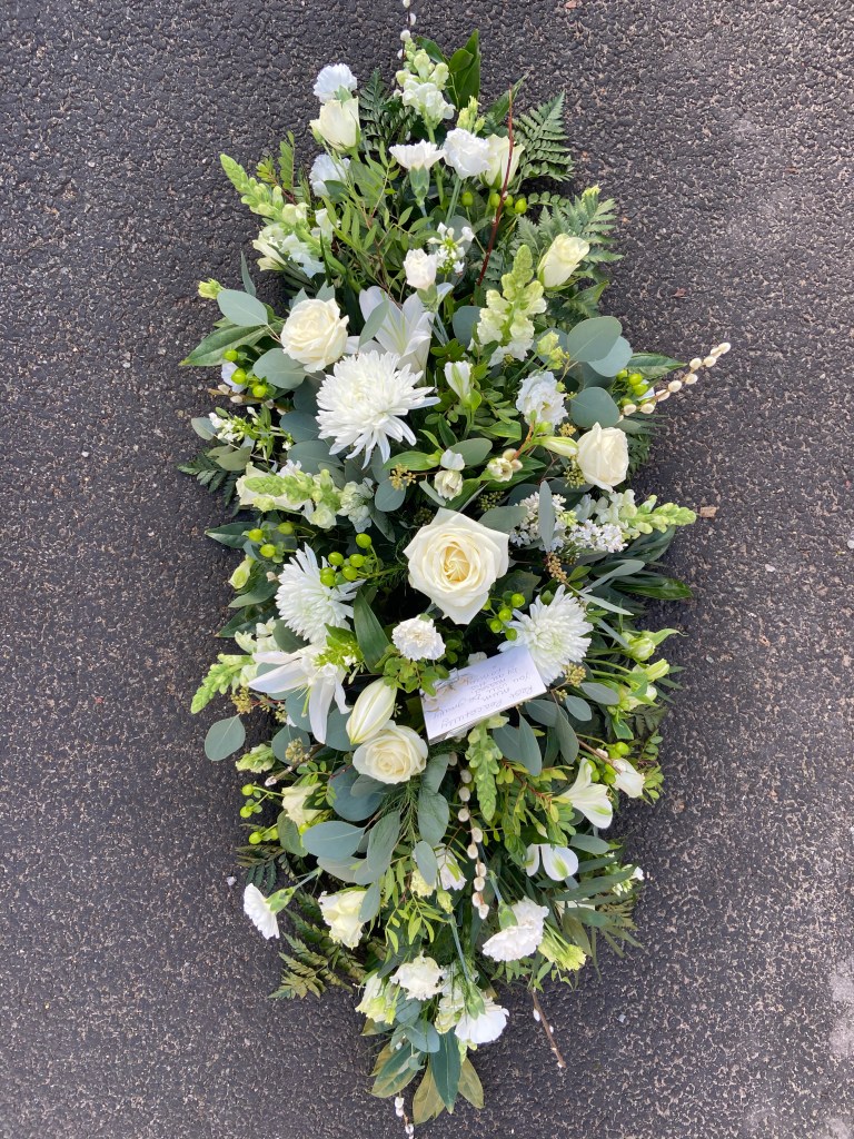 A traditional long arrangement that is an elegant and significant way of dressing a coffin. This can be done in your choice colours and flowers (depending on availability). This is an ideal tribute to be from a whole family, or a popular option for a partner or spouse. The starting prices allow for a mixed seasonal selection of flowers, for more specific designs (e.g. all red roses or all lilies) please contact us for a quote.