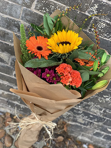 A seasonal selection of flowers, (picked by us) wrapped in brown kraft paper and tied with raffia. This is a great option for a simple gift, with eco friendly wrapping. If you would like a gift wrapped bouquet, please refer to our other designs.
